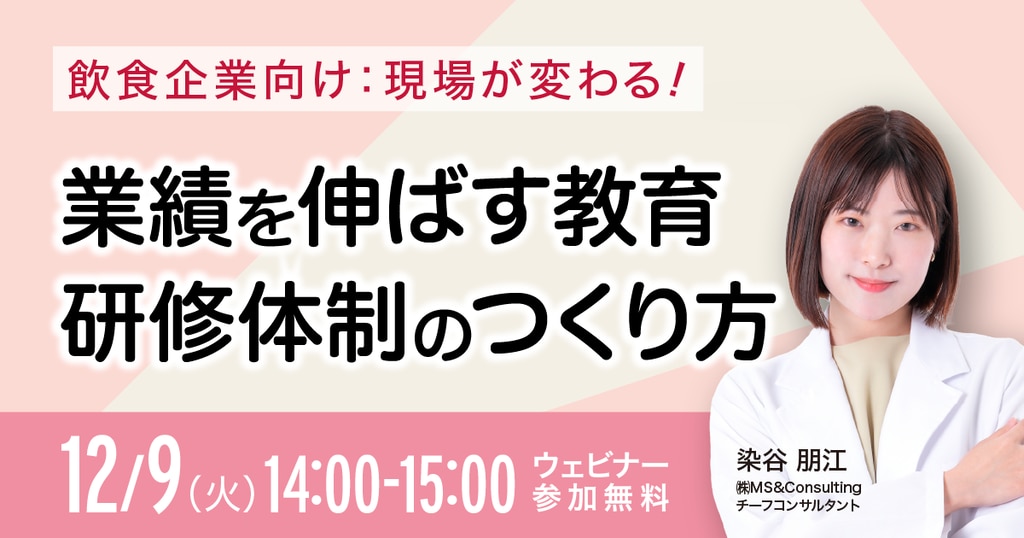 【飲食企業向け】現場が変わる!業績を伸ばす教育・研修設計セミナー:受付中セミナー:WEBセミナーセミナー:人材育成・開発セミナー:店舗組織マネジメントセミナー:飲食セミナー:売上アップセミナー:研修2025-11-13 15:00