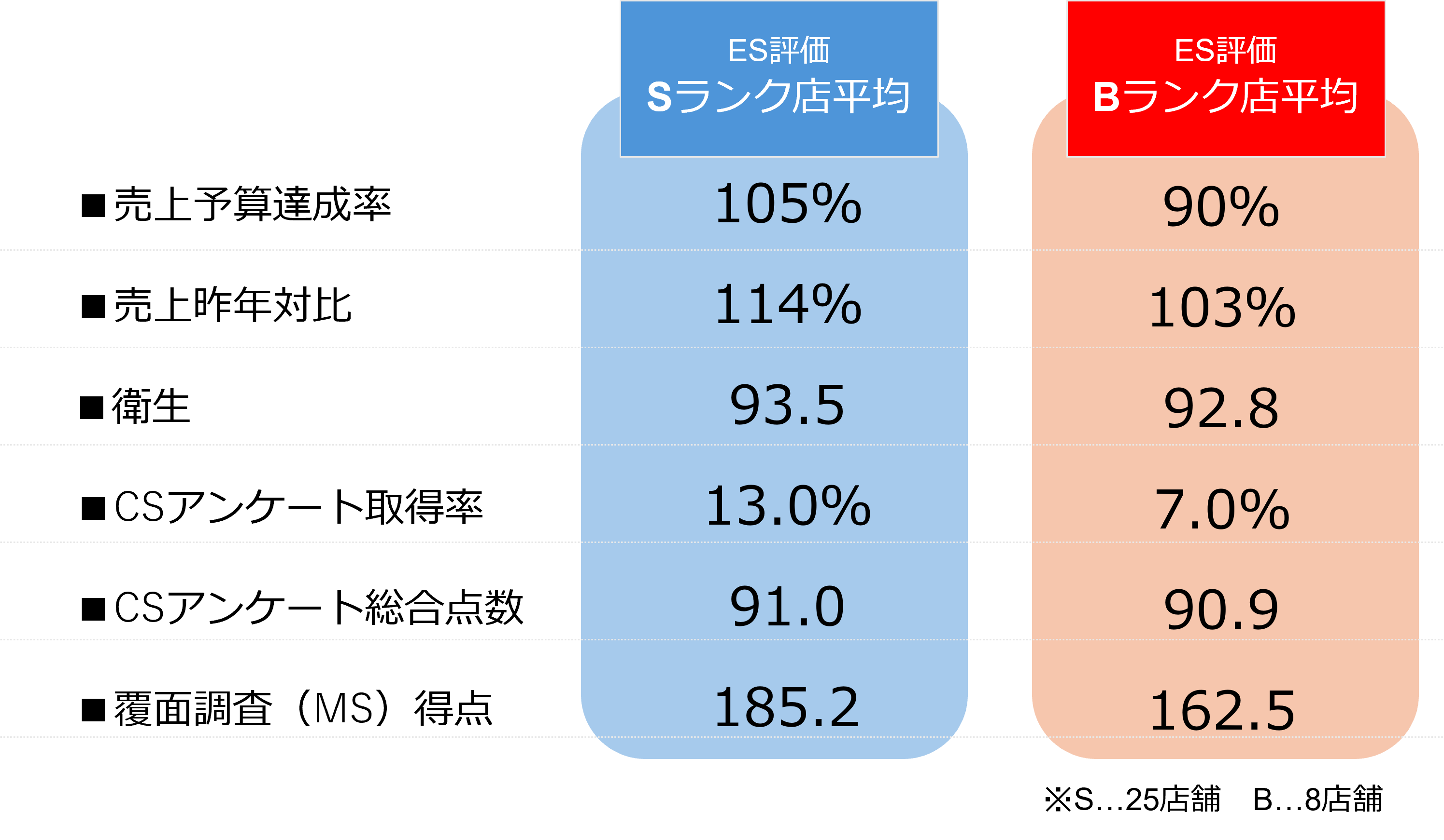 ES評価は半年に1回の頻度でMS&Consulting社の「tenpoketチームアンケート」を行っていますが、私たちの調査では、ESスコアが高いSランクの店舗群は、スコアが低いBランクの店舗群に比べて、売上予算達成率もCS評価も明らかに高いという結果が出ています【図4】。ESスコアは「店舗運営の質を高めるスタート点である」という考えから、私たちはESスコアも把握すべき指標としてダッシュボード化しています。