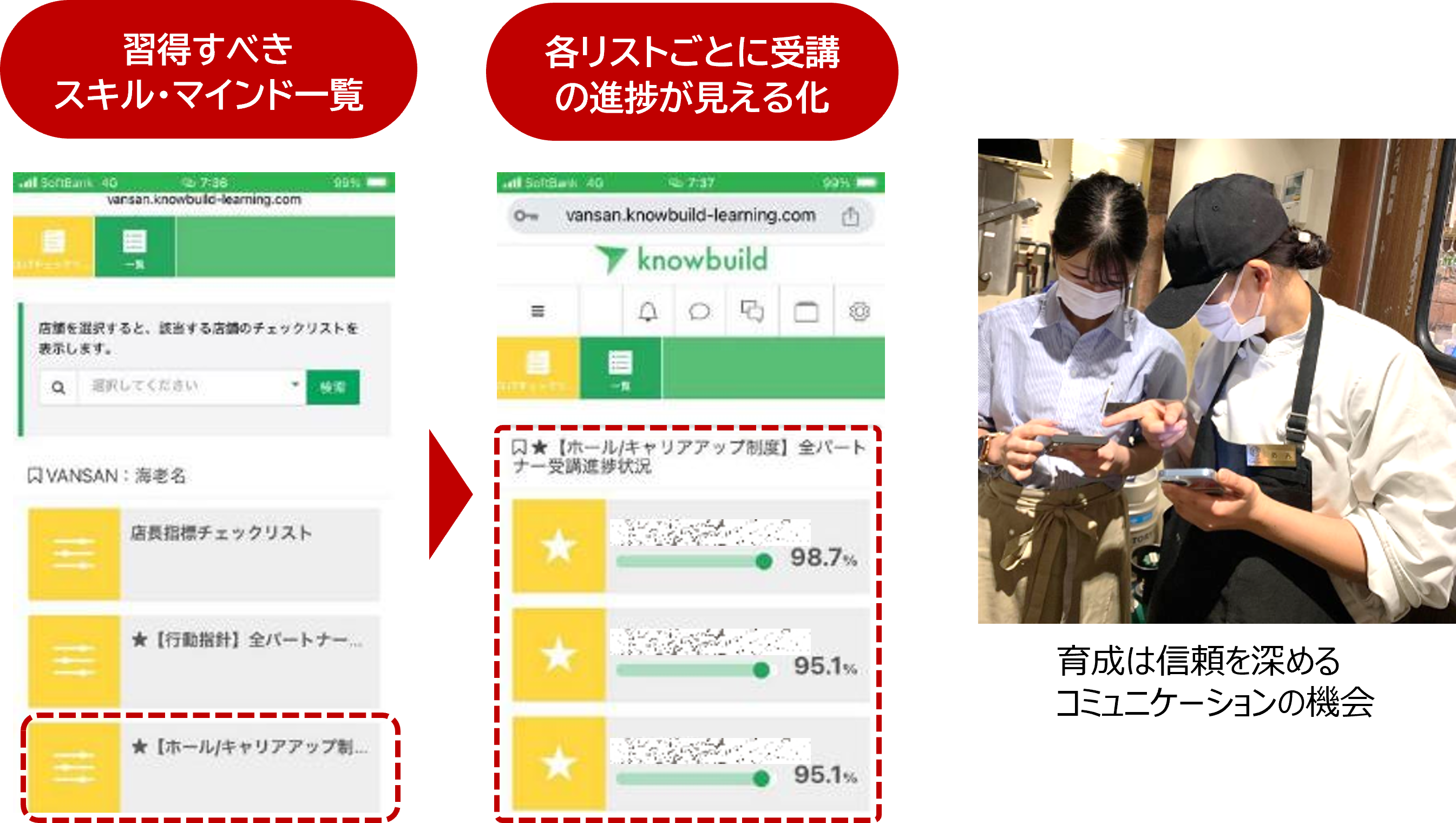 多店舗展開を支える3つ目の仕組みは「コミュニケーションラインの確立」です。この仕組みの本質は「賞賛」です。教育内容はEラーニングシステムやOJTチェックなどで標準化されていて、全店で再現性のある運営ができるようになっています。一方で、それだけではマニュアル通りの仕事どまりです。だからこそ、VANSANでは賞賛の場を意図的に設け、「やらされている」から「自分でやる」という自分事への転換を促しています。